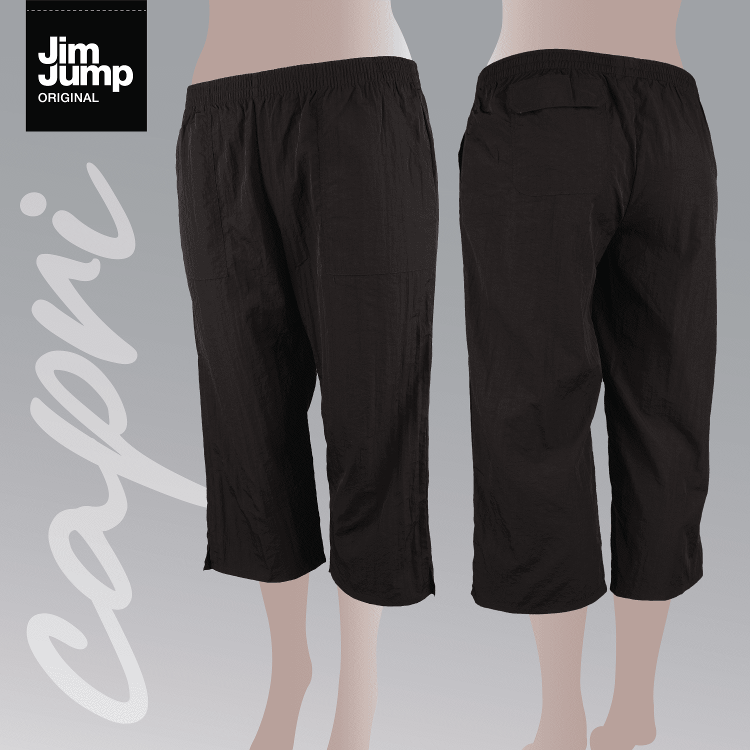 Stylish Lightweight 3/4 Capri Pant with soft elastic waist for comfort. Two front pockets and a covered back pocket.