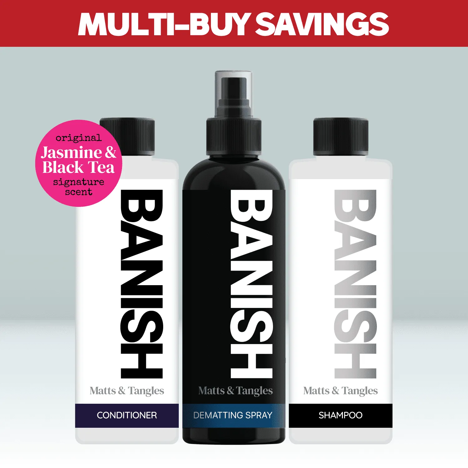 Are matted coats and shave-offs leaving you frustrated? Transform your grooming experience with BANISH—your ultimate defense against knots and tangles. This award-winning range offers a complete solution with its detangling shampoo, super conditioner, and dematting spray, delivering immediate results and long-lasting protection. Whether you’re a salon professional or a pet owner, BANISH helps preserve coat integrity, improve manageability, and maintain natural texture with ease.