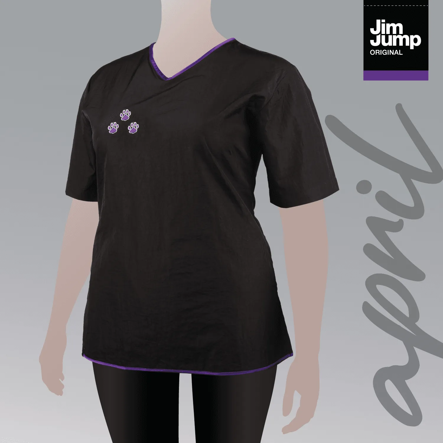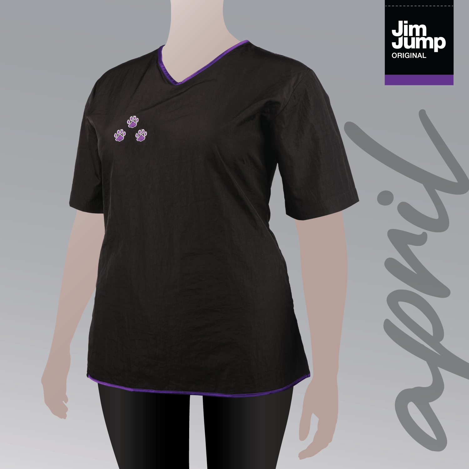 The April smock is a fitted black top with contrasting neck and hem line in purple, with embroidered paws on the front of the garment. It has two side vents for easy wearing.