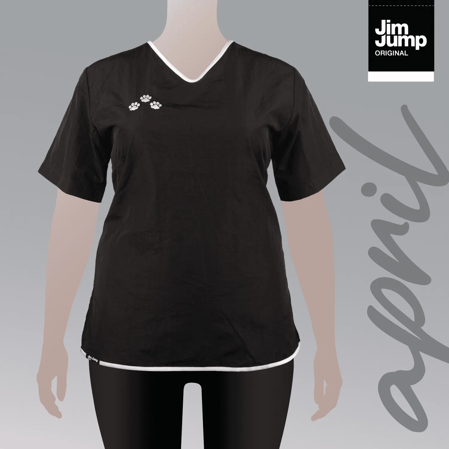 The April smock is a fitted black top with contrasting neck and hem line in white, with embroidered paws on the back of the garment. It has two side vents for easy wearing.