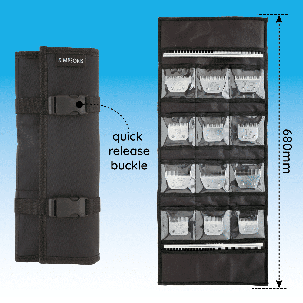 I am very pleased with this blade case. The clear pockets make it easy to find which blade I am looking for. The velcro makes the pockets easy to access during grooming and the pockets keep the blades safe and clean. The case folds away nice and compactly saving space in my grooming bag. I already have a similar case by another brand but I prefer this one due to the handy hook and pocket feature.