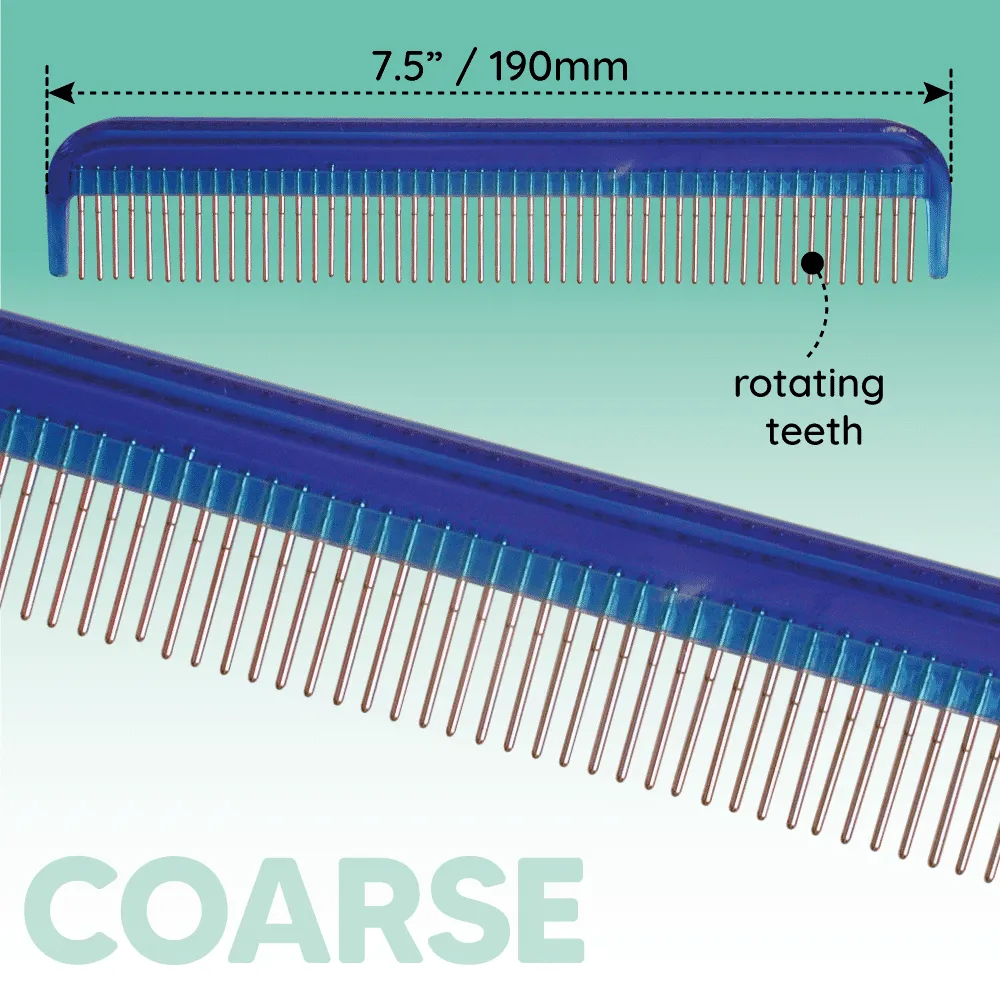 - Rotating teeth reduce pain: 51 silky smooth stainless-steel teeth continuously rotate 360 degrees to prevent pet hair from wrapping around the pin and pulling on the tender undercoat preventing pain. Vet’s recommend rotating tooth pet combs because teeth that rotate are much gentle on pet hair and skin. You will notice your dog does not flinch or pull away from you as you clear mats and groom. Rotating teeth significantly reduce pulling which prevents pain.